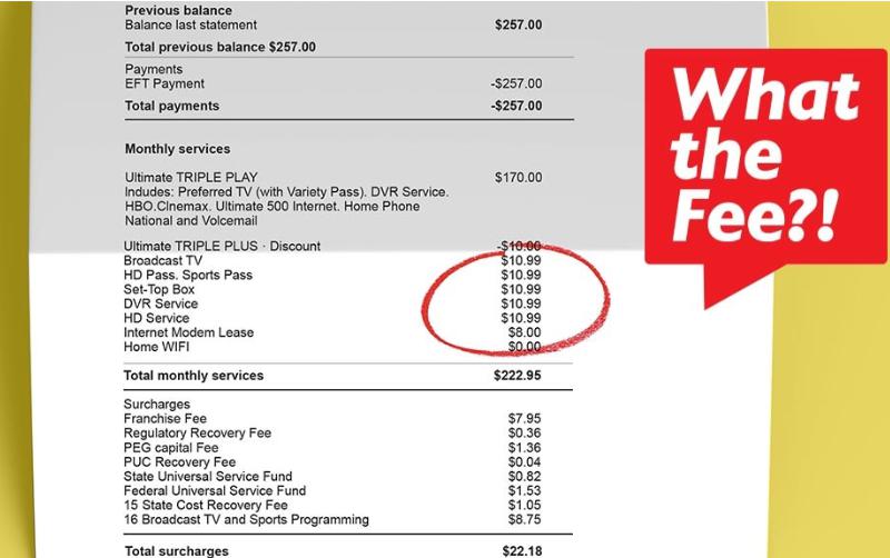 《消費(fèi)者報(bào)告》聲稱,有線電視公司大約在10年前就開始在套餐價(jià)格的基礎(chǔ)上加收額外費(fèi)用,例如廣播電視費(fèi)、地區(qū)體育附加費(fèi),高清技術(shù)費(fèi)以及網(wǎng)絡(luò)訪問和維護(hù)費(fèi)。該出版物估計(jì),這些公司征收的費(fèi)用使消費(fèi)者每月花費(fèi)約37美元(每年達(dá)450美元)。該出版物還聲稱,這些有線電視費(fèi)用包括13個(gè)項(xiàng)目費(fèi)用,付費(fèi)電視提供商每年可從收取公司征收的費(fèi)用中獲得約280億美元的收入。