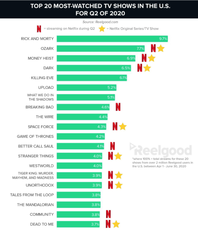 看看6月當(dāng)季所有流媒體服務(wù)中觀看次數(shù)最多的電視節(jié)目,就能真正凸顯出Netflix在流媒體方面的主導(dǎo)地位。下面的圖表是根據(jù)今年4月1日至6月30日期間超過(guò)200萬(wàn)Reelgood用戶觀看的最多流媒體節(jié)目編制的。如圖所示,今年第二季度20部收視率最高的電視節(jié)目中有11部都在Netflix上,其中包括《黑錢勝地》、《紙鈔屋》、《暗黑》、《絕命毒師》、《太空部隊(duì)》、《風(fēng)騷律師》、《怪奇物語(yǔ)》、《虎王》、《離經(jīng)叛道》、《社區(qū)》和《麻木不仁》。