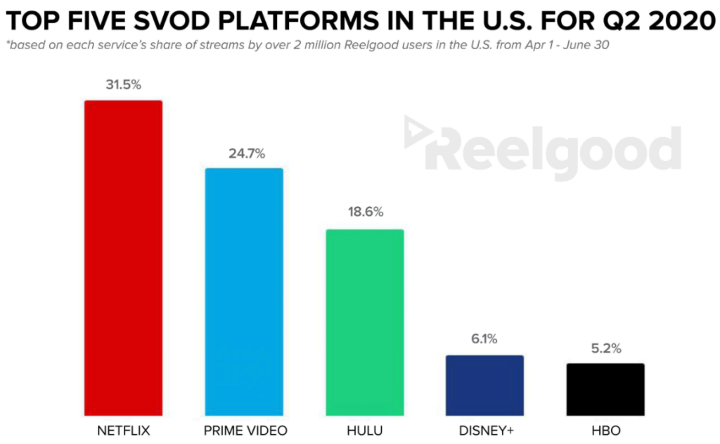 根據(jù)Reelgood的數(shù)據(jù),排名前五的流媒體服務(wù)中,Netflix排名第一,其次是Prime Video、Hulu、Disney+和HBO。