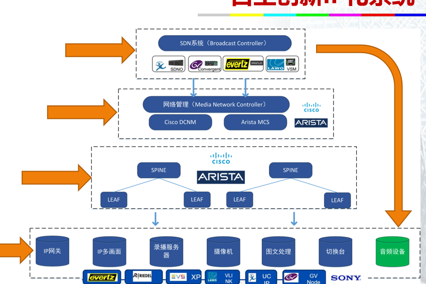 國際上比較公用的IP化系統(tǒng)的框除中,最底層是媒體直播設(shè)備,包括IP多畫面、攝像機等等,核心是網(wǎng)絡(luò)交換設(shè)備,上層跑的是網(wǎng)絡(luò)控制器,最上層是SDN。SDN一定要能控到底層的媒體接點的設(shè)備,系統(tǒng)才能跑得通,假設(shè)是索尼的設(shè)備,便就要以索尼的LSM實現(xiàn),防止其封閉。