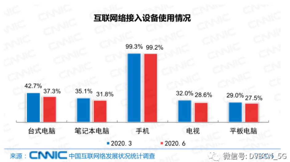 網民手機上網比例達99.2%,使用臺式電腦為37.3%,筆記本電腦為31.85,電視上網為28.6%,平板電腦為27.5%。