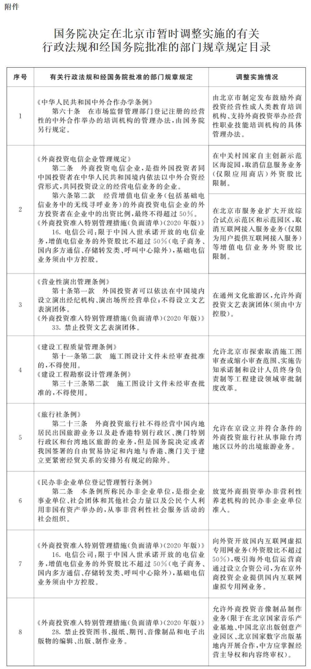 本次批復(fù)同意在北京市暫時調(diào)整實(shí)施《中華人民共和國中外合作辦學(xué)條例》、《外商投資電信企業(yè)管理規(guī)定》、《營業(yè)性演出管理?xiàng)l例》、《建設(shè)工程質(zhì)量管理?xiàng)l例》、《建設(shè)工程勘察設(shè)計管理?xiàng)l例》、《旅行社條例》、《民辦非企業(yè)單位登記管理暫行條例》、《外商投資準(zhǔn)入特別管理措施(負(fù)面清單)(2020年版)》的有關(guān)規(guī)定。