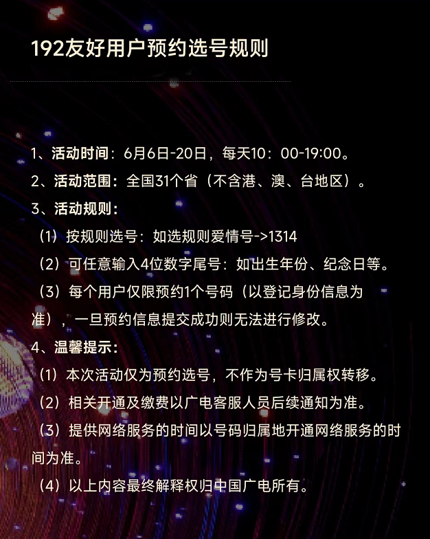 2022年6月6日,中國廣電在京舉行中國廣電品牌升級暨廣電5G和融合業(yè)務(wù)品牌發(fā)布會,籌備許久的“中國廣電”、“廣電5G”、“廣電慧家”三大品牌標(biāo)識及廣告語正式對外公布。同時,期待許久的全國范圍內(nèi)的廣電5G友好用戶“192”號碼預(yù)約也正式啟動。