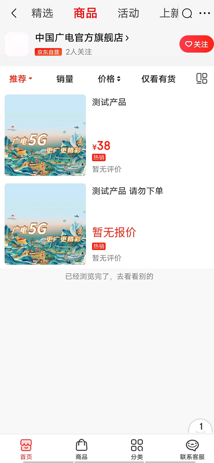 京東網(wǎng)店方面該店已被標(biāo)注為京東自營,尚不清楚相關(guān)的企業(yè)主體是否為中廣電移動公司,但其商店主界面近期有在進行廣電5G號卡產(chǎn)品的售賣測試。