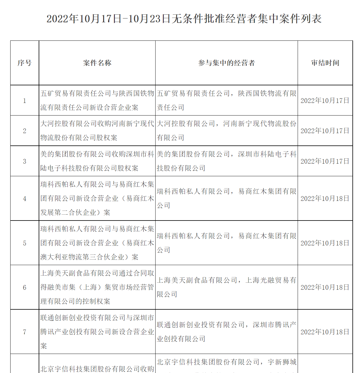 根據(jù)國家市場監(jiān)管總局于10月27日公示的《2022年10月17日-10月23日無條件批準經(jīng)營者集中案件列表》,由聯(lián)通創(chuàng)新創(chuàng)業(yè)投資有限公司與深圳市騰訊產(chǎn)業(yè)創(chuàng)投有限公司設立的合營企業(yè)案獲無條件批準,審結(jié)時間為10月18日。