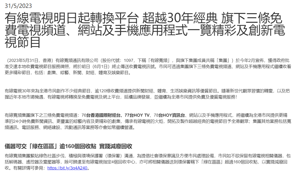 歸還牌照、終止有線電視收費(fèi)信號!香港有線寬頻全面迎接收視轉(zhuǎn)型新時(shí)代