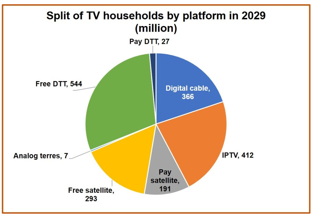 到2023年底,全球付費(fèi)電視在電視家庭的滲透率為56%,到2029年底略有下降至54%。