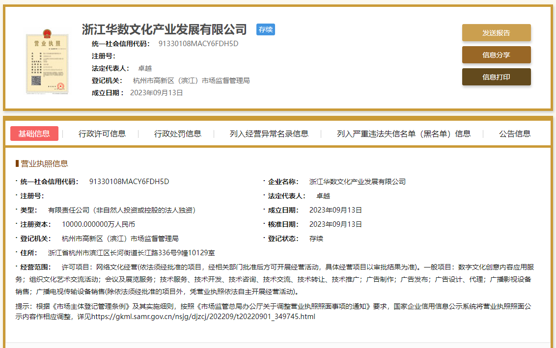 公示信息顯示,新公司名為——浙江華數(shù)文化產(chǎn)業(yè)發(fā)展有限公司,注冊(cè)資本達(dá)10000.000000萬(wàn)元人民幣(1億元),成立日期為2023年9月13日,而華數(shù)傳媒為其獨(dú)家出資。