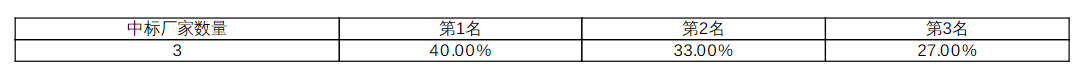 對中標人數(shù)量設(shè)置為3家(不接受聯(lián)合體),具體份額分配比例為: