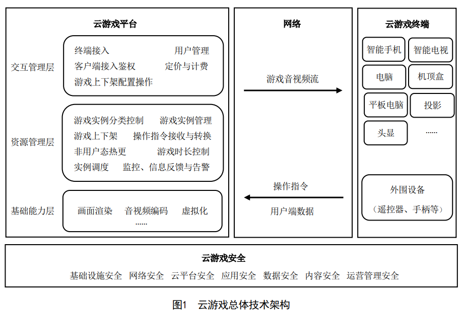 云游戲總體技術(shù)架構(gòu)包括云游戲平臺、網(wǎng)絡(luò)、云游戲終端和云游戲安全四個部分,具體見圖1。