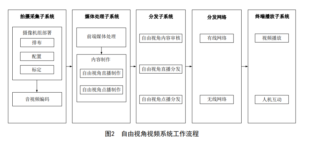 自由視角視頻系統(tǒng),指采用多機(jī)位或環(huán)繞機(jī)位拍攝,獲得一定范圍內(nèi)環(huán)繞焦點(diǎn)多角度的視頻信息,經(jīng)過制作、傳輸、分發(fā)、播放等環(huán)節(jié),可為用戶提供特定范圍內(nèi)多視角連續(xù)切換,并形成空間位置自由移動視覺效果的一種視頻直播/點(diǎn)播系統(tǒng)。