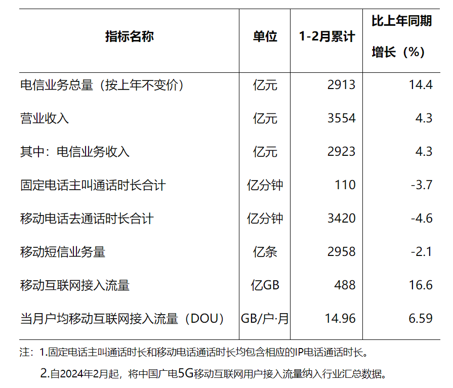 根據(jù)說明,自2024年2月起,將中國廣播電視網(wǎng)絡(luò)集團(tuán)有限公司的5G移動電話用戶數(shù)、5G移動互聯(lián)網(wǎng)接入流量、5G移動互聯(lián)網(wǎng)用戶數(shù)納入行業(yè)匯總數(shù)據(jù),上年同期數(shù)據(jù)進(jìn)行同步調(diào)整。