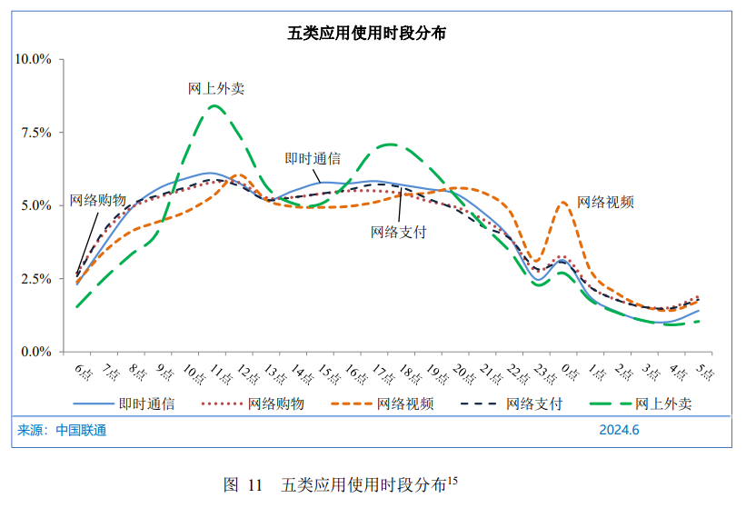 截至2024年6月,我國(guó)網(wǎng)民的人均每周上網(wǎng)時(shí)長(zhǎng)14為29.0個(gè)小時(shí),較2023年12月提升2.9個(gè)小時(shí)。手機(jī)網(wǎng)民較常使用的五類(lèi)App中,即時(shí)通信類(lèi)App在9點(diǎn)至20點(diǎn)間用戶(hù)使用時(shí)段分布較為均勻,占比均在5%以上;網(wǎng)絡(luò)視頻類(lèi)App在12點(diǎn)、20點(diǎn)分別出現(xiàn)兩次使用小高峰,符合大部分網(wǎng)民閑暇娛樂(lè)時(shí)間規(guī)律;網(wǎng)絡(luò)購(gòu)物類(lèi)、網(wǎng)絡(luò)支付類(lèi)App的用戶(hù)使用時(shí)段分布趨勢(shì)較為接近,7點(diǎn)到22點(diǎn)間使用時(shí)長(zhǎng)合計(jì)占比超過(guò)80%;網(wǎng)上外賣(mài)類(lèi)App使用時(shí)段分布峰值明顯,與網(wǎng)民用餐時(shí)間關(guān)聯(lián)度很高,分別在11點(diǎn)及18點(diǎn)出現(xiàn)使用峰值。