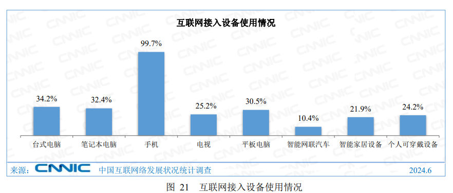 我國(guó)網(wǎng)民使用手機(jī)上網(wǎng)的比例達(dá)99.7%;使用臺(tái)式電腦、筆記本電腦、電視和平板電腦上網(wǎng)的比例分別為34.2%、32.4%、25.2%和30.5%;使用智能網(wǎng)聯(lián)汽車(chē)、智能家居設(shè)備和個(gè)人可穿戴設(shè)備上網(wǎng)的比例分別為10.4%、21.9%和24.2%,其中,使用智能網(wǎng)聯(lián)汽車(chē)上網(wǎng)的網(wǎng)民規(guī)模達(dá)到1.15億人。