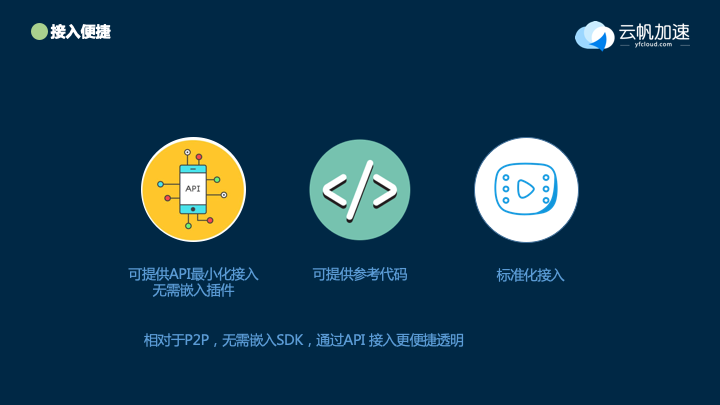 值得一提的是,云帆超級CDN的使用將不再必須依賴SDK植入,支持透明開放的最小化API接入方式,為開發(fā)者免除對于植入第三方模組在應(yīng)用安全性上的后顧之憂。因為API接入的方式足夠簡單透明,實際上也為開發(fā)者實現(xiàn)更高級功能創(chuàng)造了條件。