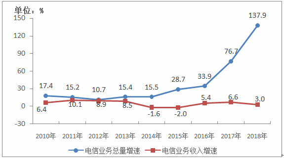 初步核算,2018年電信業(yè)務(wù)總量達到65556億元(按照2015年不變單價計算),比上年增長137.9%。電信業(yè)務(wù)收入累計完成13010億元,比上年增長3.0%。
