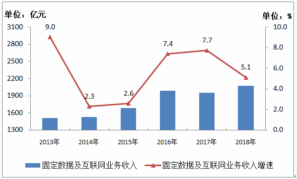 圖1-4 2013-2018年固定數(shù)據(jù)及互聯(lián)網(wǎng)業(yè)務(wù)收入發(fā)展情況