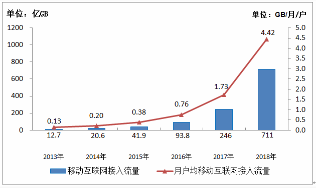 2018年,各種線上線下服務(wù)加快融合,移動互聯(lián)網(wǎng)業(yè)務(wù)創(chuàng)新拓展,帶動移動支付、移動出行、移動視頻直播、餐飲外賣等等應(yīng)用加快普及,刺激移動互聯(lián)網(wǎng)接入流量消費保持高速增長。2018年,移動互聯(lián)網(wǎng)接入流量消費達711億GB③,比上年增長189.1%,增速較上年提高26.9個百分點。全年移動互聯(lián)網(wǎng)接入月戶均流量(DOU)達4.42GB/月/戶,是上年的2.6倍;12月當(dāng)月DOU高達6.25GB/月/戶。其中,手機上網(wǎng)流量達到702億GB,比上年增長198.7%,在總流量中占98.7%。