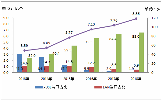 圖4-1 2013-2018年互聯(lián)網(wǎng)寬帶接入端口發(fā)展情況