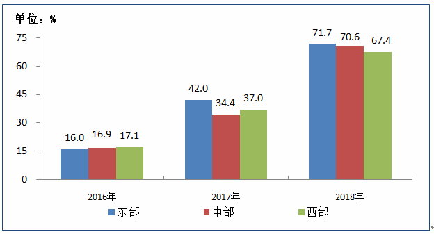 圖5-2 2016-2018年東、中、西部地區(qū)100Mbps及以上固定寬帶接入用戶滲透率情況