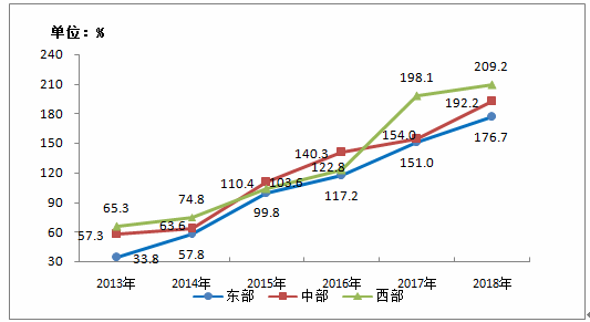 圖5-3 2012-2018年東、中、西部移動互聯(lián)網(wǎng)接入流量增速情況