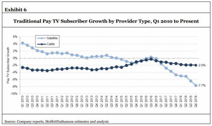 但經(jīng)過仔細(xì)研究后發(fā)現(xiàn),衛(wèi)星占這些損失的絕大部分:DirecTV和Dish去年合計損失了236萬用戶。雖然在2019年初的表現(xiàn)來看,今年對于DirecTV和Dish來說情況有所改善,但他們的狀況依然不足以樂觀。
