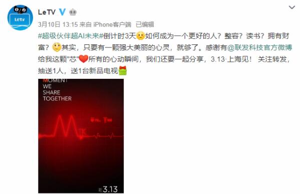 昨天,樂融致新通過其官方微博@LeTV,在預(yù)熱大會倒計時3天時稱「感謝有@聯(lián)發(fā)科技官方微博 給我這顆『芯』所有的心動瞬間,我們還要一起分享,3.13·上海見」,同時證實了將有一款新品電視屆時發(fā)布的消息。
