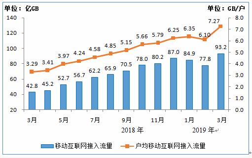 當(dāng)月戶均移動互聯(lián)網(wǎng)接入流量(DOU)超7GB。一季度,移動互聯(lián)網(wǎng)累計流量達256億GB,同比增長129.1%;其中通過手機上網(wǎng)的流量達到255億GB,同比增長133.2%,占移動互聯(lián)網(wǎng)總流量的99.5%。3月當(dāng)月戶均移動互聯(lián)網(wǎng)接入流量(DOU)達到7.27GB,同比增長121.1%。