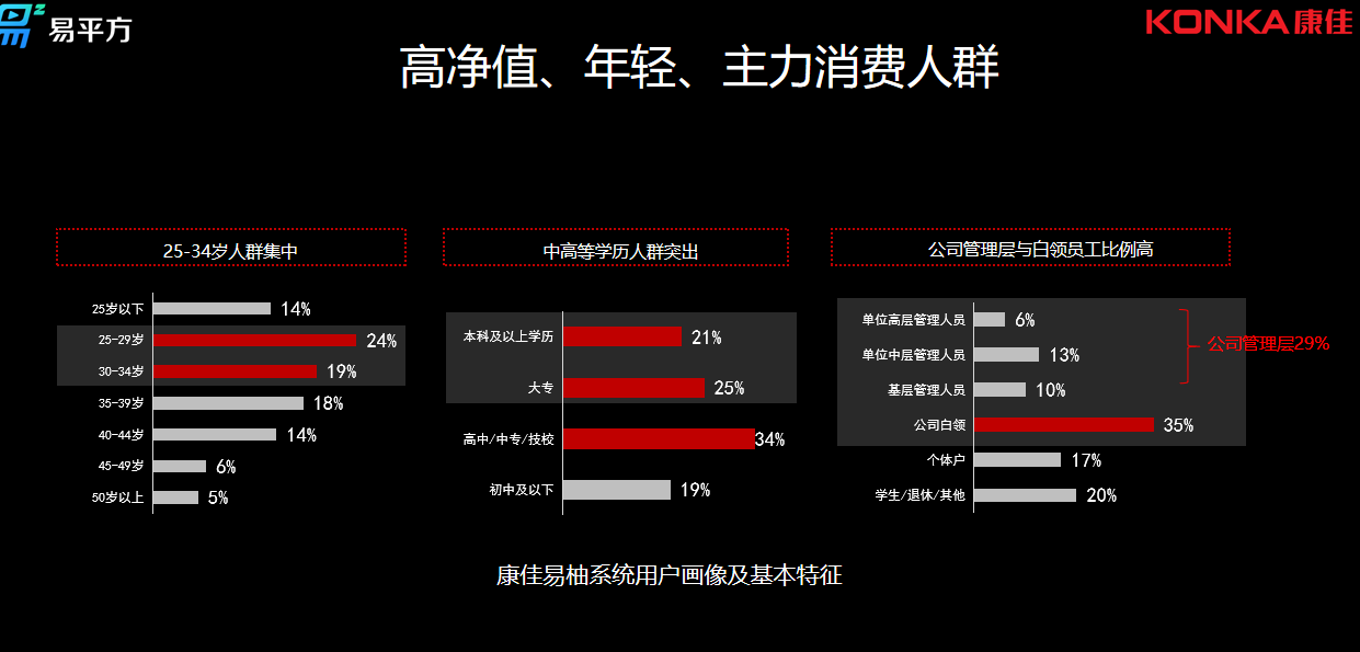 通過調研及大數(shù)據(jù)統(tǒng)計發(fā)現(xiàn),康佳易柚系統(tǒng)的用戶,年齡主要集中在25-34歲,中高等學歷人群占比達到近50%,公司管理層與白領員工占比達到29%,說明康佳有著高凈值、年輕且是主力消費人群。鹿晗的代言也給康佳帶來了大量的年輕化粉絲用戶,根據(jù)第一財經商業(yè)數(shù)據(jù)中心所出具的明星消費影響力排行榜顯示,鹿晗位居Top3;此外,鹿晗的出圈率也很高,這也說明鹿晗的影響力不止在自身粉絲當中。鹿晗粉絲年齡整體年輕化與康佳用戶基本吻合,25歲-34歲人群眾鹿晗的影響力高于整體藝人水平。這次代言的簽約,也將加速整個康佳品牌的年輕化進程。